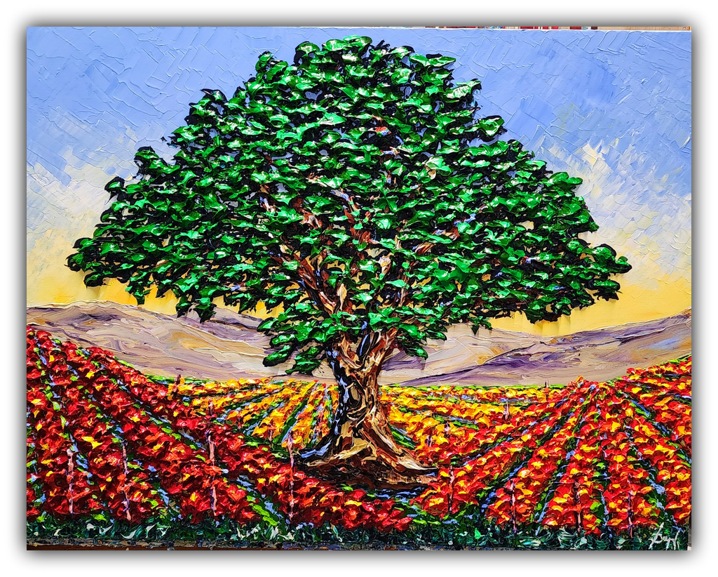 This artwork is a celebration of color, texture, and the richness of wine country. With its commanding central tree, impressionistic vineyard rows, and luminous layered sky, it invites the viewer into a vibrant and immersive autumn landscape.