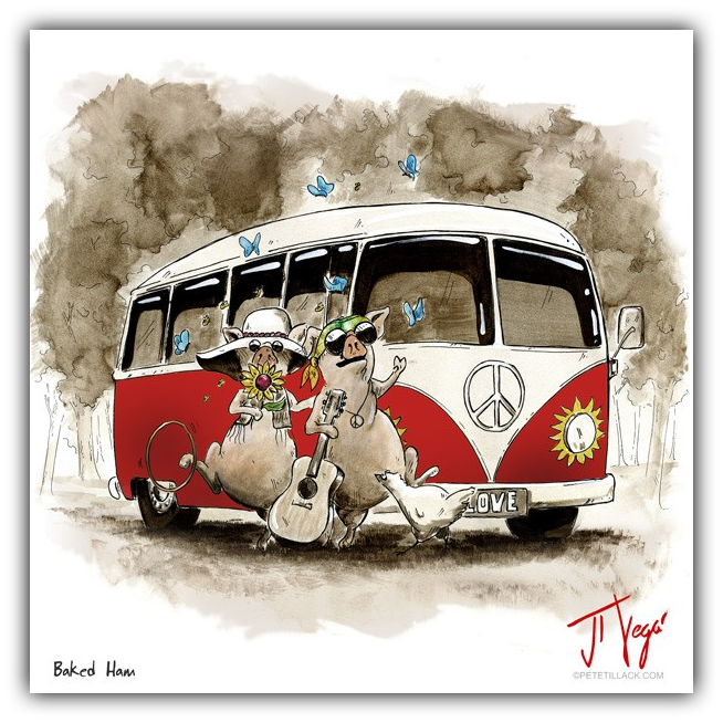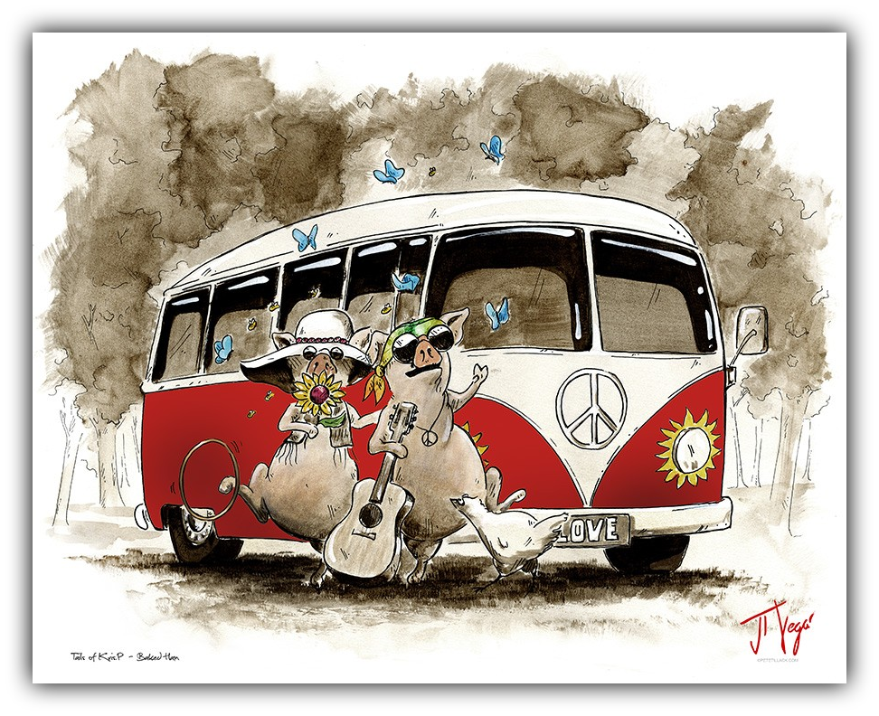 Celebrate peace, love, and a splash of humor with Baked Ham by JT Vegar. Two happy pigs jam beside their vintage Volkswagen (VW) bus while butterflies dance around—pure, whimsical joy from Vegar’s beloved Piggy Tales series. Choose the classic red VW bus or the groovy tie-dye VW bus to match your vibe.
