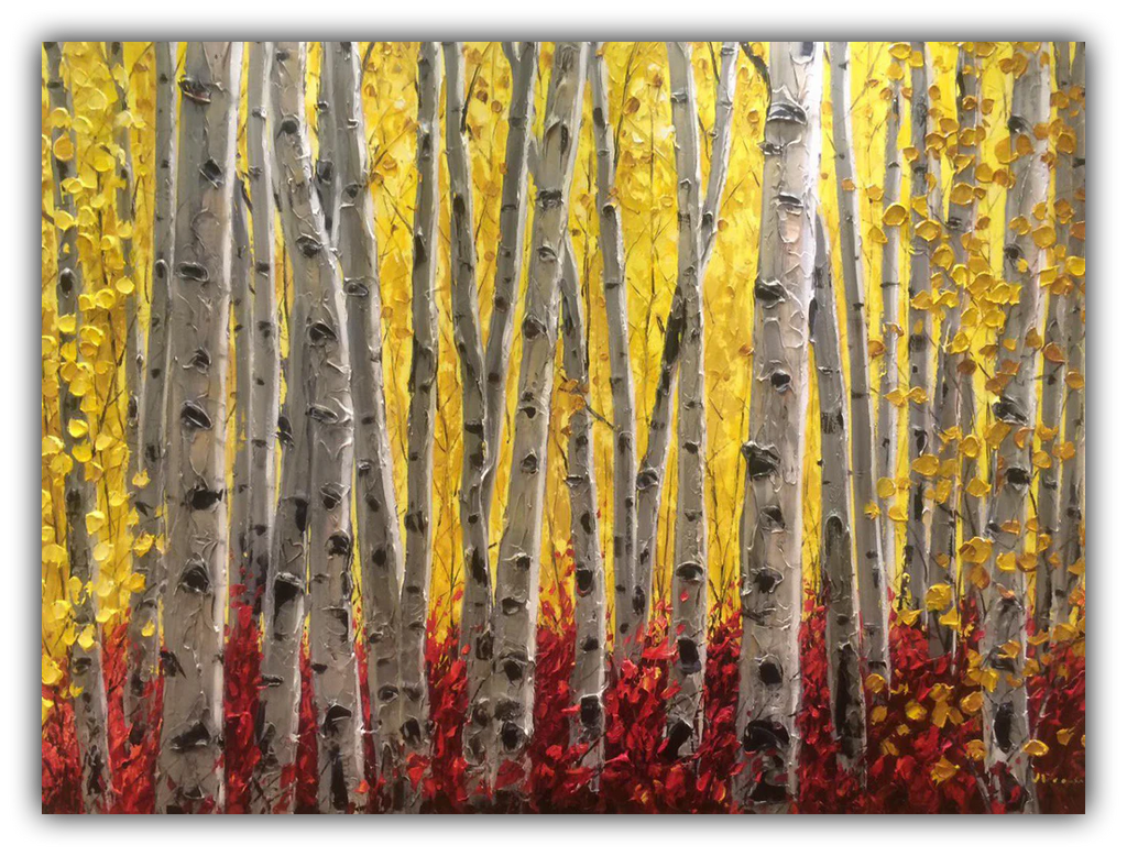 Step into a radiant forest of gold with Aspen Sunshine, a limited edition giclée on canvas by internationally collected artist Jennifer Vranes. Bathed in warm light, this breathtaking composition captures tall white aspens glowing with golden leaves above a forest floor of rich crimson. Vranes’ signature textured palette knife technique brings each tree to life, creating depth, movement, and the unmistakable brilliance of a sunlit autumn day.