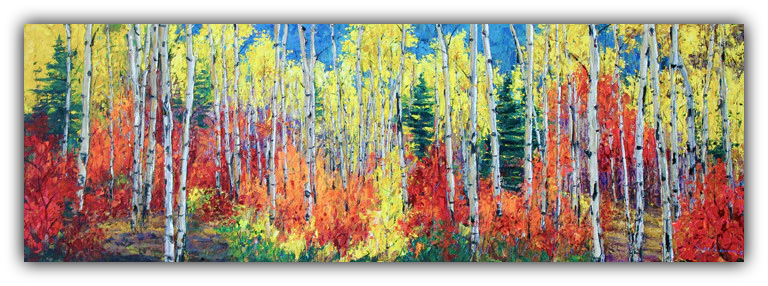 Immerse yourself in the vibrant colors of autumn with Fall Sensation, a limited edition giclée on canvas by internationally collected artist Jennifer Vranes. This panoramic masterpiece captures a brilliant forest of golden aspens and fiery red foliage illuminated beneath a clear blue sky. The bold palette and textured brushwork evoke the crisp air and breathtaking beauty of fall in full bloom.
