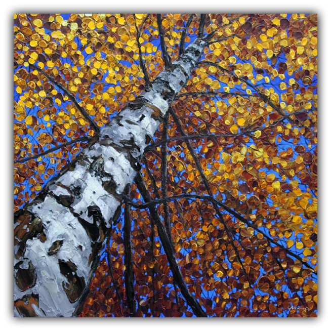 Look up into the golden canopy of autumn with Day Dreaming, a limited edition giclée on canvas by internationally collected artist Jennifer Vranes. This stunning perspective draws the viewer’s eye skyward along the trunk of a white aspen, its branches bursting with brilliant gold and amber leaves against a vibrant blue sky. Bold texture and radiant color create an uplifting, dreamlike vision of nature’s beauty.