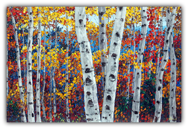 Celebrate the brilliance of autumn with Aspen Confetti, a stunning limited edition giclée on canvas by renowned landscape artist Jennifer Vranes. This breathtaking piece captures the magic of fall aspens, their white trunks standing tall against a dazzling forest of golden yellow, fiery orange, and crimson red leaves — a true explosion of seasonal color.