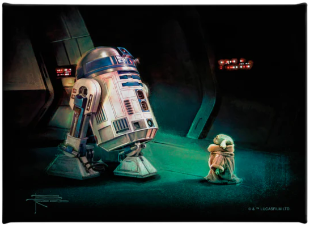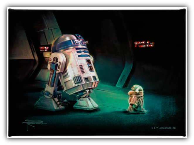 In this tender moment frozen in time, two unlikely souls connect across the vastness of differences. R2-D2, weathered guardian of secrets and survivor of countless battles, stands before the diminutive Grogu, whose ancient eyes hold wisdom beyond his childlike appearance. The stark corridor of what appears to be a spacecraft bathes in an ethereal emerald glow—not merely lighting the scene but symbolising the living Force that binds these two beings across generations. This is more than a chance encounter; it's the convergence of guardians spanning the Skywalker legacy. R2-D2 represents the mechanical witness to the entire saga—from Anakin's rise to Luke's redemption—now facing the newest threat in this cosmic tapestry. Grogu, with his innocent posture yet ancient spirit, embodies both vulnerability and untapped potential, a living bridge between the Jedi of old and whatever the future holds. The darkness surrounding them speaks to the uncertain times, while the distant red control panels hint at the ever-present danger lurking beyond this quiet moment. Yet in this sanctuary of shadow and steel, something profound occurs—a passing of knowledge, perhaps, or simply recognition between two beings who have each, in their own way, witnessed the turning of galactic history.