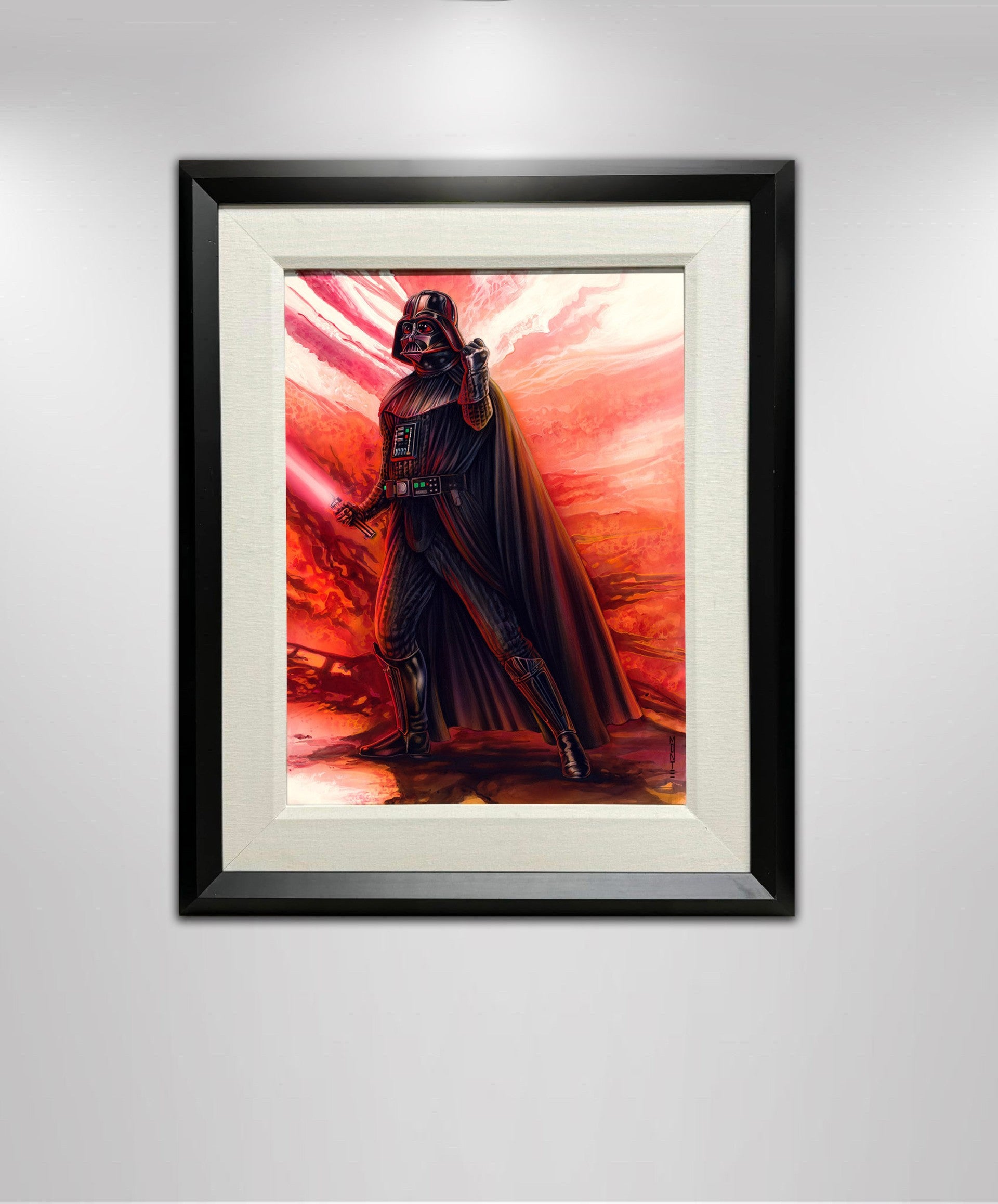 Monte Moore’s Darth Vader the Sith is a powerful tribute to one of the most iconic villains in pop culture. This 24 x 18" original acrylic painting on illustration board captures the dark menace of Darth Vader as he stands poised with his lightsaber, bathed in the fiery glow of an ominous background. The intense colors and striking details reflect Moore’s masterful use of light and texture, bringing the legendary Sith Lord to life in a visually stunning work of art.