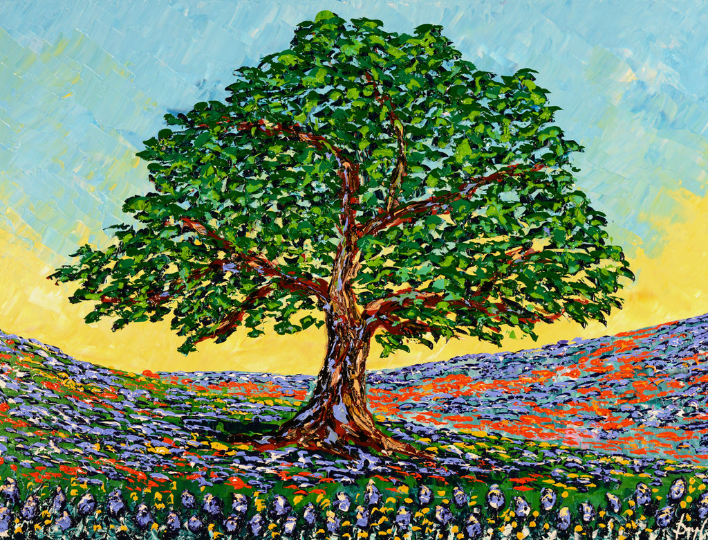 Radiant and full of life, Mighty Oak of the Meadow is a 36"x48" original acrylic painting by contemporary French Impressionist Isabelle Dupuy. This vibrant composition celebrates the strength and serenity of nature, featuring a magnificent oak tree rising proudly from a meadow carpeted in blooming wildflowers. Shades of violet, gold, and crimson ripple across the rolling hills beneath a brilliant golden sky, infusing the scene with warmth and vitality.